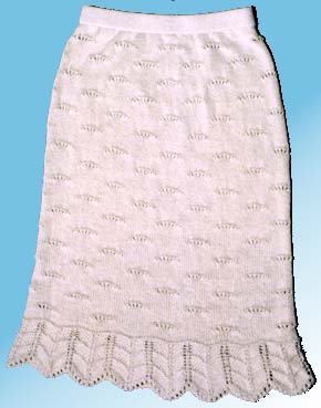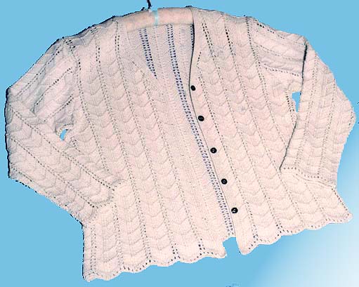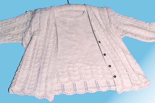 カーディガンの模様は豪華にし、セーター・スカートはシンプルにし、裾のみカーディガンの模様を4段入れました。
