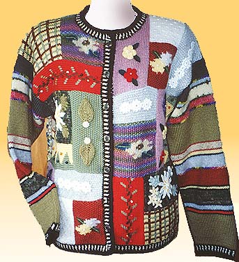 前身頃は1枚ずつ手芸を施しつなぎあわせ、袖と後身頃は縞模様にしました。さまざまな糸を使ったのでゲージ調整に苦労しました。
