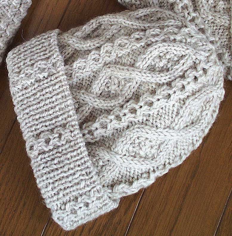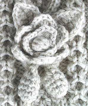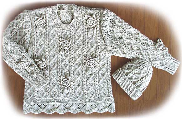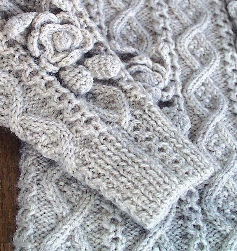 カジュアルになりがちなアラン模様ですが、裾をスカラップにしたり、小物をつけることにより、女の子らしいセーターになりました。